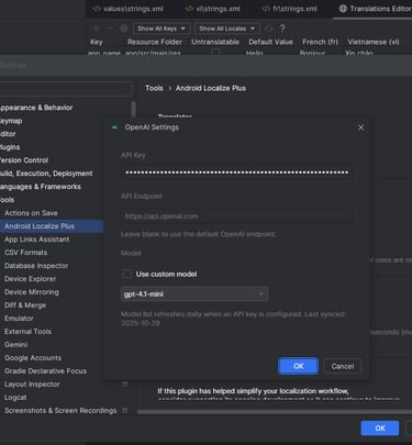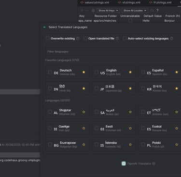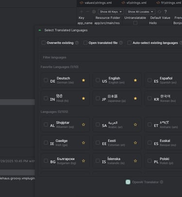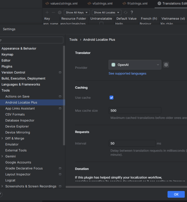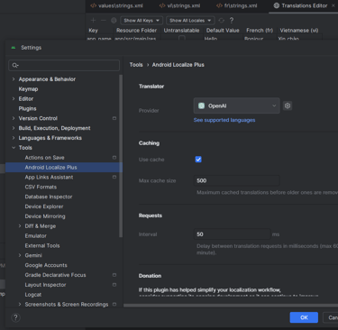 Once installed, the plugin scans your strings.xml and translates all entries automatically with a single click.